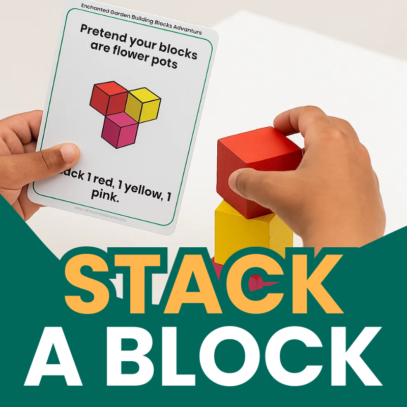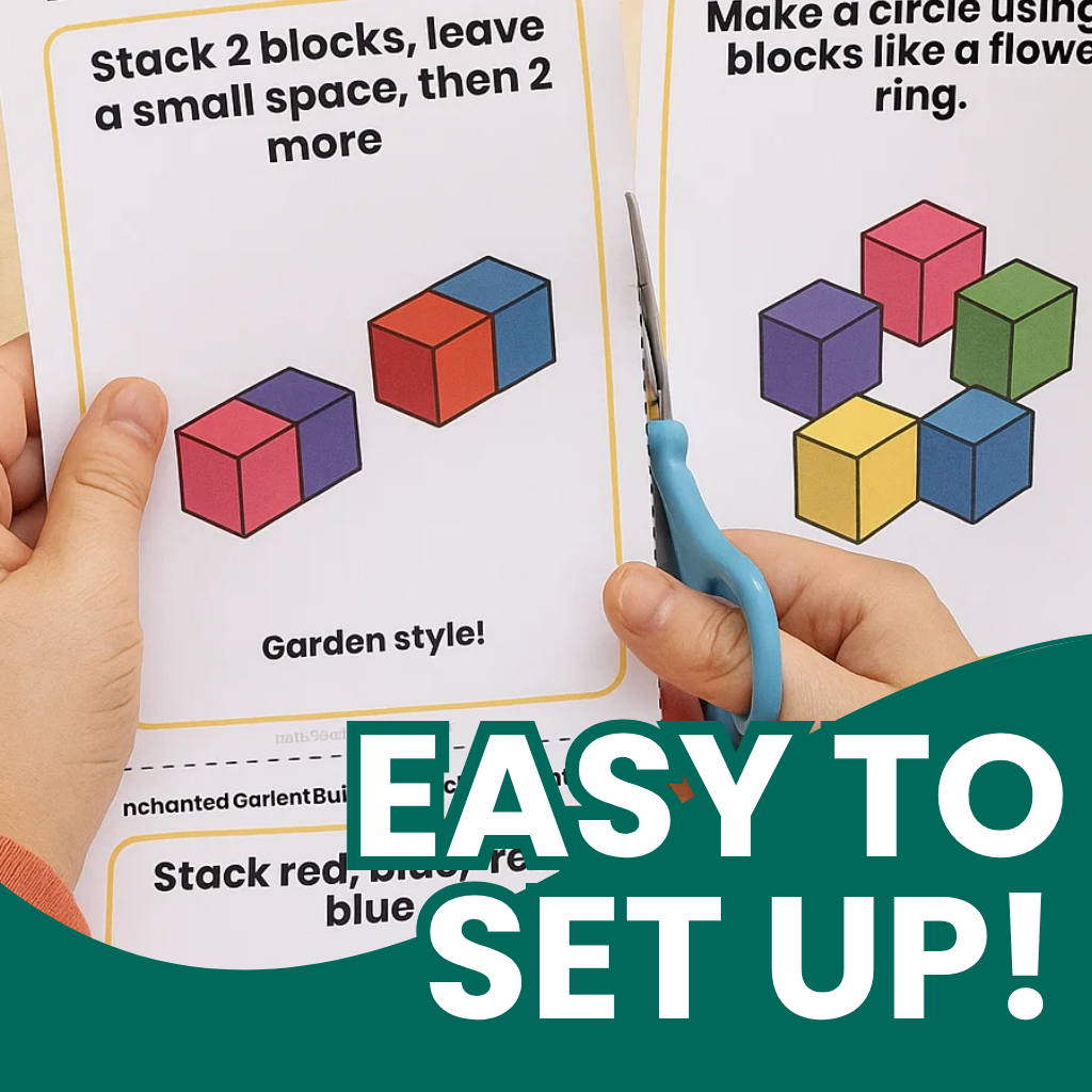 Pair these cards with stacking blocks, bricks, or wooden toys to bring each prompt to life. It’s hands-on learning with a sprinkle of storytelling and creativity.